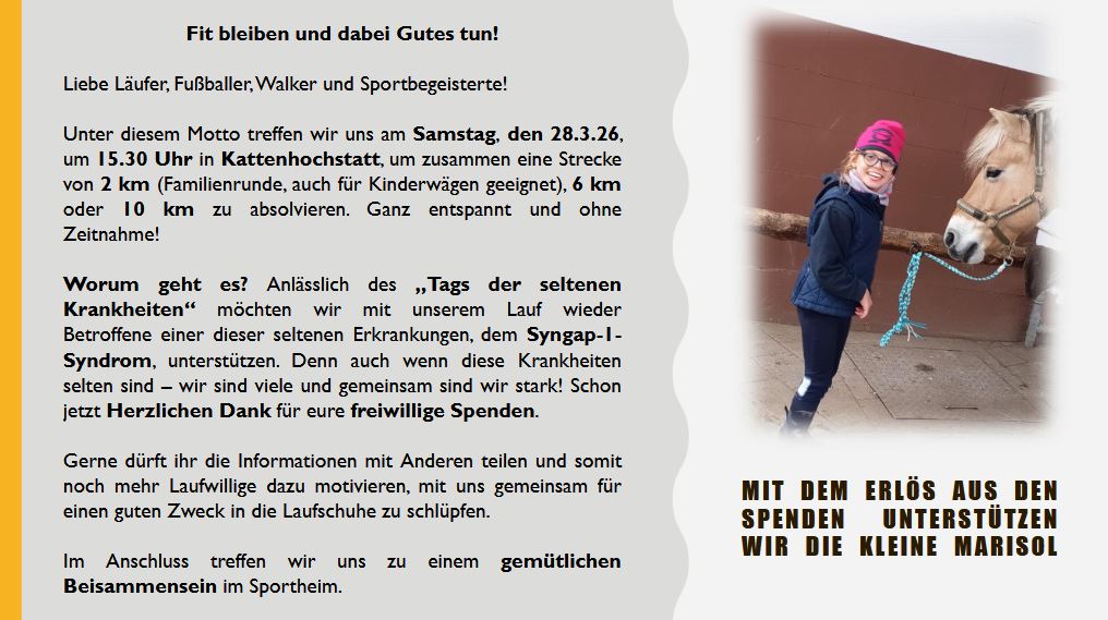 Fit bleiben und dabei Gutes tun – Unter diesem Motto treffen wir uns am Samstag, den 28.3.26, um 15.30 Uhr in Kattenhochstatt, um zusammen eine Strecke von 2 km (Familienrunde, auch für Kinderwägen geeignet), 6 km oder 10 km zu absolvieren. Ganz entspannt und ohne Zeitnahme!