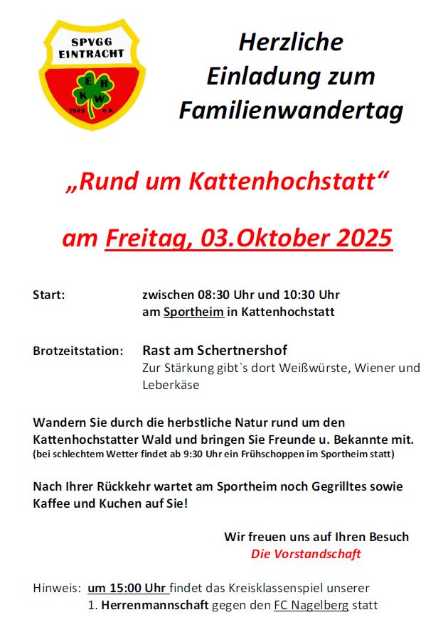 Wandern Sie am Freitag, den 3. Oktober, durch die herbstliche Natur rund um den Kattenhochstatter Wald und bringen Sie Freunde und Bekannte mit. Bei schlechtem Wetter findet ab 9:30 Uhr ein Frühschoppen im Sportheim statt. Nach Ihrer Rückkehr wartet am Sportheim noch Gegrilltes sowie Kaffee und Kuchen auf Sie!