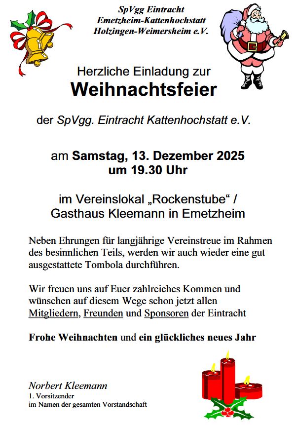 Zur diesjährigen Weihnachtsfeier des Gesamtvereins lädt die Vorstandschaft ganz herzlich ein. Neben dem offiziellen Teil warten wieder die traditionelle Tombola sowie gemütliche Stunden auf die Mitglieder und Freunde der Eintracht. Los geht es am Samstag, den 13. Dezember, um 19:30 Uhr in der Rockenstube Emetzheim.