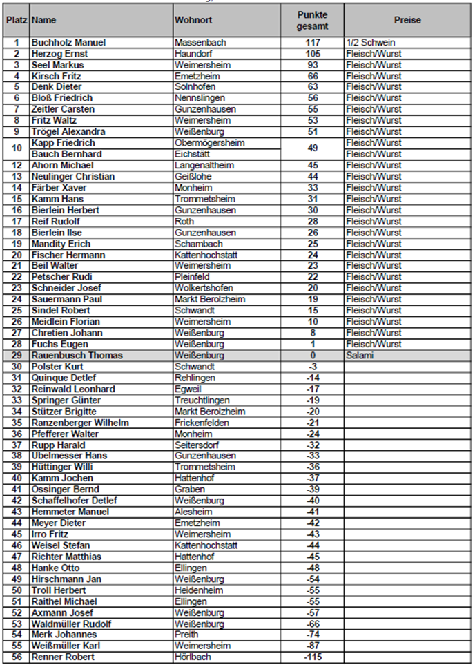 Manuel Buchholz aus Massenbach, besser bekannt als „Buchi“, durfte als Lohn ein halbes Schwein als Hauptpreis mit nach Hause nehmen. Auf den weiteren Plätzen folgten Ernst Herzog aus Haundorf auf Rang zwei sowie Markus Seel aus Weimersheim auf dem dritten Platz.