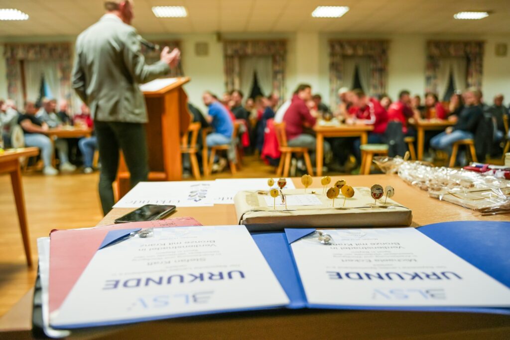 Nach der Wahl richtete der scheidende Vorstand Norbert Kleemann noch einige persönliche Worte an die Versammlung und lies sein Wirken in den letzten 30 Jahren im Verein, davon 10 als 1. Vorsitzender, Revue passieren. Die Versammlung dankte ihm mit stehenden Ovationen, auch der Ehrenvorsitzende Hans Gempel ergriff das Wort, um sich bei Kleemann zu bedanken. Anschließend übernahm das neue Führungstrio, dass sich an den Dank in Richtung Norbert Kleemann, aber auch an die weiteren ausgeschiedenen Vorstandsmitglieder anschloss. Ihnen wurde ein kleines Präsent überreicht, gegenüber Norbert Kleemann aber auch verbunden mit dem Hinweis, dass es dies noch nicht gewesen sein soll, und er bei angemessener Gelegenheit noch einmal ausgiebiger bedacht werden wird.