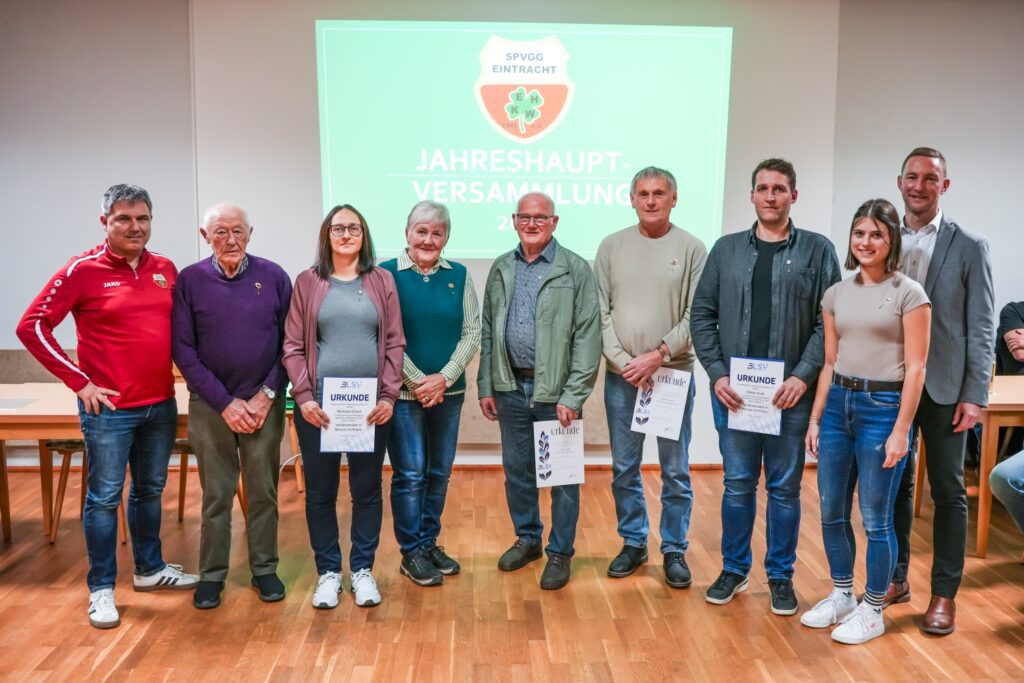 Julia Rührer (10 Jahre Mitgliedschaft), Renate Gempel (25 Jahre), Reinhard Eckert (50 Jahre), Herbert Luithle (60 Jahre). Erstmals konnte mit Hermann Fischer auch ein Mitglied für 70 Eintracht-Jahre ausgezeichnet werden.